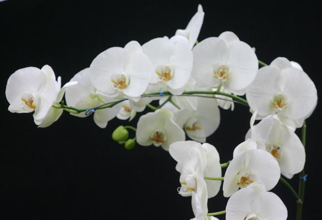 Vicki carried the orchid to work one morning and set it on my desk. A white phalaenopsis nearly two feet tall in a beautiful cachepot nestled in a florist’s white gift box. Spanish moss covered the redwood planting bark. Three willowy bloom spikes were supported by thin, green bamboo stakes. Some widely opened snowy blossoms, more on the verge, and swelling buds emerged from the stems. Elegant. Exotic. Breathtaking.